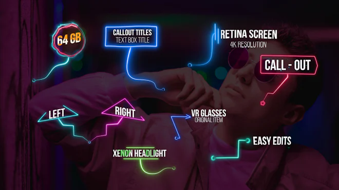 Neon Call Outs is a super cool looking and creatively animated After Effects template that contains 8 neat and dynamically animated text animations. You can use them to display a to highlight and enhance the important people, products and places in your videos. Impress your audience with this clean, clear and creatively animated AE template. No plugins required.