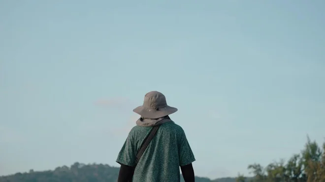 A Person In A Wide Sun Hat Stands Facing The Open Sky On A Calm Bright Day
