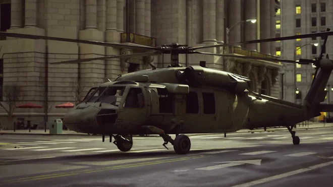 Military Helicopter Prepares For Action In Urban Setting At Night