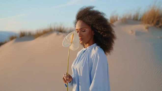 Model Cover Face Flower Standing At Desert Closeup. Calm Woman Posing With Calla