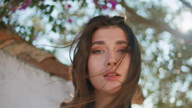 Windy Hair Lady Posing Summer Nature Portrait. Sexy Model Face Looking Camera